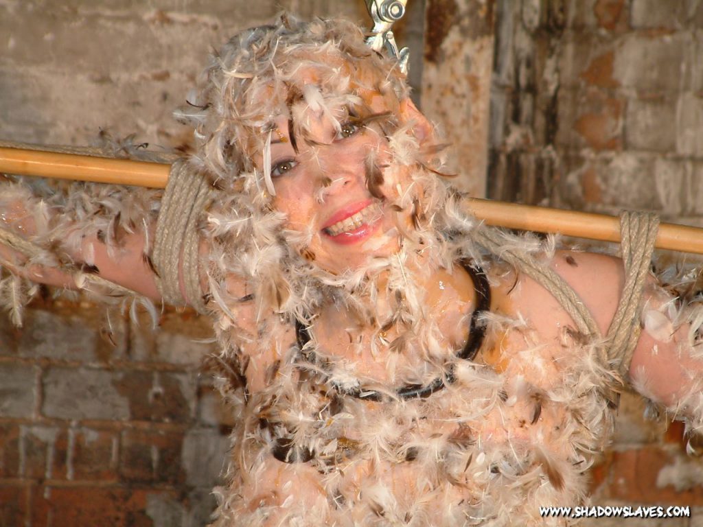 Bald Asian Fetish model Kumi Monsters feather bondage and bizarre oriental rope works on tied bondagette covered in sticky syrup and feathers while restrained helplessly as a damsel in distress in the dungeon Website URL: https://www.fetishwebcamblog.com/2018/05/12/catalinas-latex-catsuit/ Country List: Austria